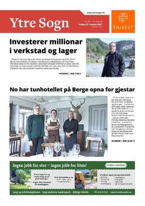 Ytre Sogn 27.08.21 er en utgave av publikasjonen Ytre Sogn. Utgaven inneholder 24 sider som du kan se nedenfor. PDF filen av utgaven er 28,41 MB. Den forrige utgaven av denne publikasjonen er Ytre Sogn 24.08.21. Den neste utgaven av denne publikasjonen er Ytre Sogn 31.08.21. Trykk på linken til publikasjonen Ytre Sogn for å se informasjon om andre utgaver.