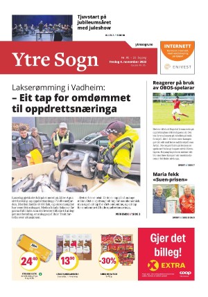 Ytre Sogn 04.11.22 er en utgave av publikasjonen Ytre Sogn. Utgaven inneholder 20 sider som du kan se nedenfor. PDF filen av utgaven er 19,89 MB. Den forrige utgaven av denne publikasjonen er Ytre Sogn 01.11.22. Den neste utgaven av denne publikasjonen er Ytre Sogn 08.11.22. Trykk på linken til publikasjonen Ytre Sogn for å se informasjon om andre utgaver.