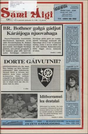 Sami Aigi 16.03.88 er en utgave av publikasjonen Sami Aigi. Utgaven inneholder 8 sider som du kan se nedenfor. PDF filen av utgaven er 11,36 MB. Den forrige utgaven av denne publikasjonen er Sami Aigi 15.03.88. Den neste utgaven av denne publikasjonen er Sami Aigi 22.03.88. Trykk på linken til publikasjonen Sami Aigi for å se informasjon om andre utgaver.