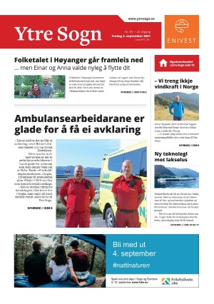 Ytre Sogn 9/3/21 is an edition of the publication Ytre Sogn. The edition contains 24 pages that you can see below. The PDF file of the edition is 30.49 MB. The previous edition of this publication is Ytre Sogn 31.08.21. The next edition of this publication is Ytre Sogn 07.09.21. Click on the publication's link Ytre Sogn to see information about other editions.