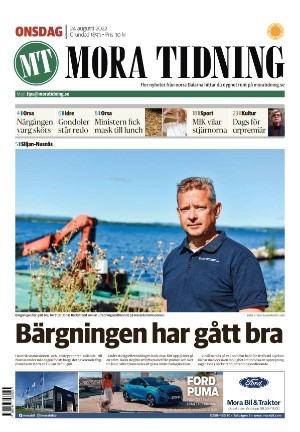Mora Tidning 8/24/22 is an edition of the publication Mora Tidning. The edition contains 36 pages that you can see below. The edition has 1 supplements that you can href="#pfc-supplements">see below. The PDF file of the edition is 16.50 MB. The previous edition of this publication is Mora Tidning 2022-08-22. The next edition of this publication is Mora Tidning 2022-08-26. Click on the publication's link Mora Tidning to see information about other editions.