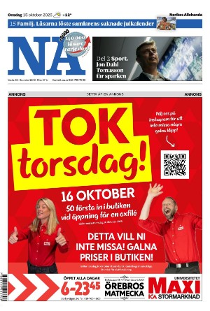 Nerikes Allehanda 15.10.25 er en utgave av publikasjonen Nerikes Allehanda. Utgaven inneholder 20 sider som du kan se nedenfor. Utgaven har 1 bilag som du kan se nedenfor. PDF filen av utgaven er 6,59 MB. Den forrige utgaven av denne publikasjonen er Nerikes Allehanda 2025-10-14. Trykk på linken til publikasjonen Nerikes Allehanda for å se informasjon om andre utgaver.