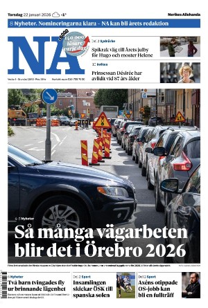 Nerikes Allehanda 22.01.26 er en utgave av publikasjonen Nerikes Allehanda. Utgaven inneholder 20 sider som du kan se nedenfor. Utgaven har 2 bilag som du kan se nedenfor. PDF filen av utgaven er 18,14 MB. Den forrige utgaven av denne publikasjonen er Nerikes Allehanda 2026-01-21. Trykk på linken til publikasjonen Nerikes Allehanda for å se informasjon om andre utgaver.