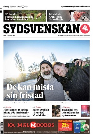 Sydsvenska Dagbladet - Malmø 02.01.26 er en utgave av publikasjonen Sydsvenska Dagbladet - Malmø. Utgaven inneholder 28 sider som du kan se nedenfor. Utgaven har 2 bilag som du kan se nedenfor. PDF filen av utgaven er 11,70 MB. Den forrige utgaven av denne publikasjonen er Sydsvenska Dagbladet - Malmø 2026-01-01. Trykk på linken til publikasjonen Sydsvenska Dagbladet - Malmø for å se informasjon om andre utgaver.