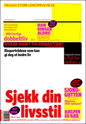 Dagbladet 9/10/05 is an edition of the publication Dagbladet. The edition contains 64 pages that you can see below. The edition has 1 supplements that you can href="#pfc-supplements">see below. The PDF file of the edition is 30.25 MB. The previous edition of this publication is Dagbladet 9/9/05. The next edition of this publication is Dagbladet 9/11/05. Click on the publication's link Dagbladet to see information about other editions.