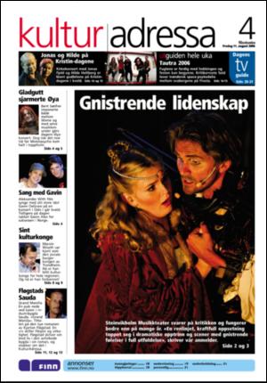 Adresseavisen Kulturadressa 8/11/06 is an edition of the publication Adresseavisen Kulturadressa. The edition contains 32 pages that you can see below. The edition is a supplement to Adresseavisen 8/11/06. The PDF file of the edition is 6.19 MB. The previous edition of this publication is Adresseavisen Kulturadressa 8/10/06. The next edition of this publication is Adresseavisen Kulturadressa 8/12/06. Click on the publication's link Adresseavisen Kulturadressa to see information about other editions.