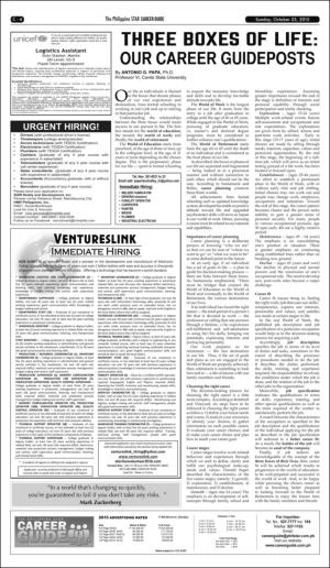 The Philippine Star Career Guide 10/25/15 is an edition of the publication The Philippine Star Career Guide. The edition contains 4 pages that you can see below. The edition is a supplement to The Philippine Star 10/25/15. The PDF file of the edition is 7.35 MB. The previous edition of this publication is The Philippine Star Career Guide 10/24/15. The next edition of this publication is The Philippine Star Career Guide 10/26/15. Click on the publication's link The Philippine Star Career Guide to see information about other editions.